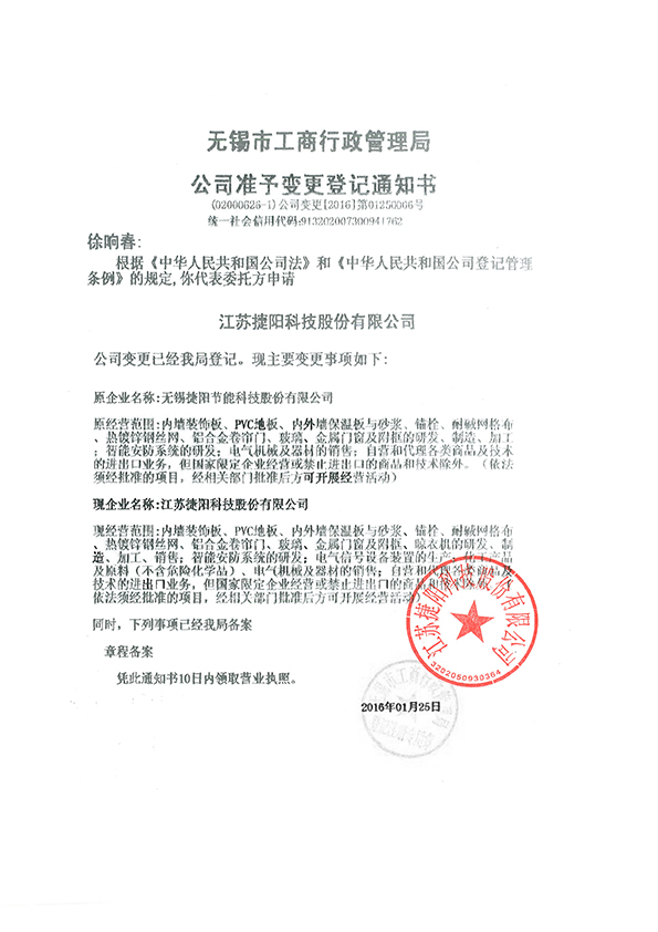 由于公司發(fā)展需要,“無錫捷陽節(jié)能科技股份有限公司”名稱從 2016 年1 月25 日變更登記為“江蘇捷陽科技股份 有限公司”,屆時(shí)原公司“無錫捷陽節(jié)能科技股份有限公司”的全部業(yè)務(wù)由江蘇捷陽科技股份有限公司繼續(xù)經(jīng)營,原公司 的所有債權(quán)債務(wù)由江蘇捷陽科技股份有限公司承繼,原公司簽訂的合同繼續(xù)有效。 即日起,公司所有對內(nèi)及對外文件、資料、開據(jù)發(fā)票,賬號(hào),稅號(hào)等全部使用新公司名稱。